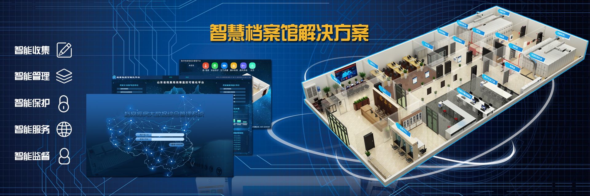 國韻作為山東省檔案庫房智能化綜合管理系統(tǒng)建設的龍頭企業(yè),為濱州市市政府設計并建設了一整套檔案庫房智能化綜合管理系統(tǒng),該系統(tǒng)將溫濕度自動測控、智能防火、智能防盜、消毒滅菌、漏水檢測、通風換氣、照明測控、視頻監(jiān)控、門禁管理、防鼠防蟲、有毒氣體檢測顯示系統(tǒng)等集成于統(tǒng)一管理平臺...